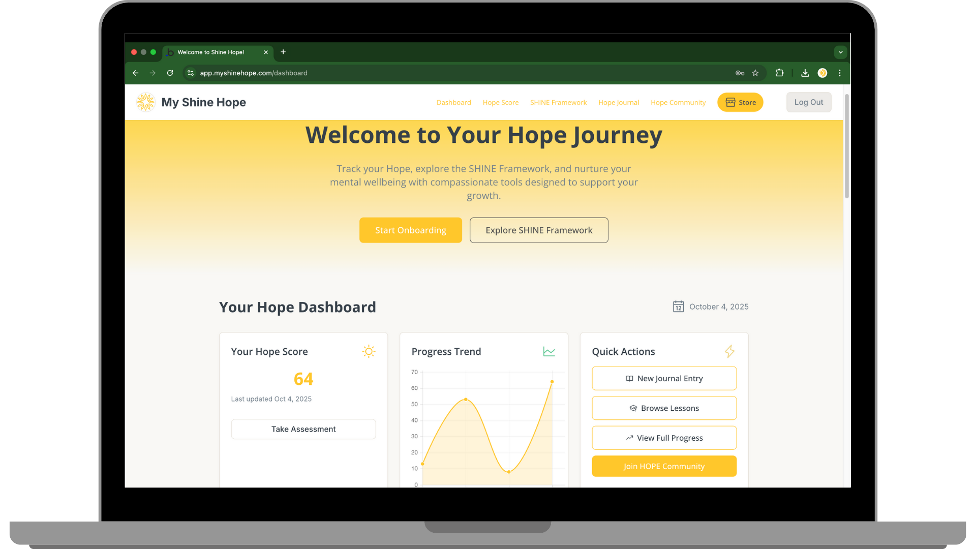 By choosing to measure your Hope, you have already taken an important step toward your future. Hope is not just something you feel, it is a muscle you can strengthen. Your Hope Score is a snapshot of where you are today, and with the My Shine Hope app, you will have the tools and practices to keep building it every day.
